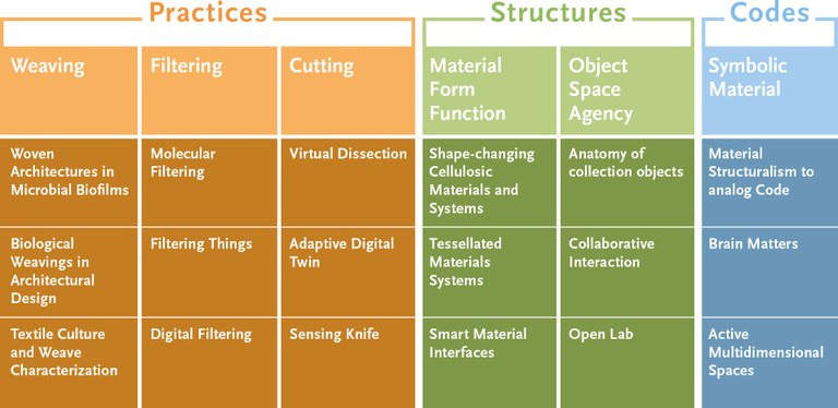 Practices serves our fundamental strategic purpose of unifying theory and practice. Our goal is to transform practices with a long cultural tradition into innovative processes, resulting in a fundamental change in our culture. Combining material processes and cultural practices is an essential research strategy for Matters of Activity enabling a highly concrete and “tangible,” but also epistemological and experimental analysis of the activity of images, spaces, and materials. We conceive weaving as a practice central to nearly all biological materials and as such highly relevant to the analysis of the material’s inner activity. Woven tissues are closely linked to filtering, which we will also study as a vitally important process in nature and culture. As a condition of possibility for the production of difference, we combine the analysis of molecular material filters and digital information filters. Cutting will be investigated as a third material and equally fundamental subtractive practice of form-building: We have selected surgery and anatomy as two critical classic cutting scenarios in which we envision bodily material tissue as a foundation for novel ways of smart material-guided cutting. Since these practices are of equal importance in nature and culture for the production of images, spaces, and materials, we will seek to harness natural processes as inspiration for the design of innovative practices.